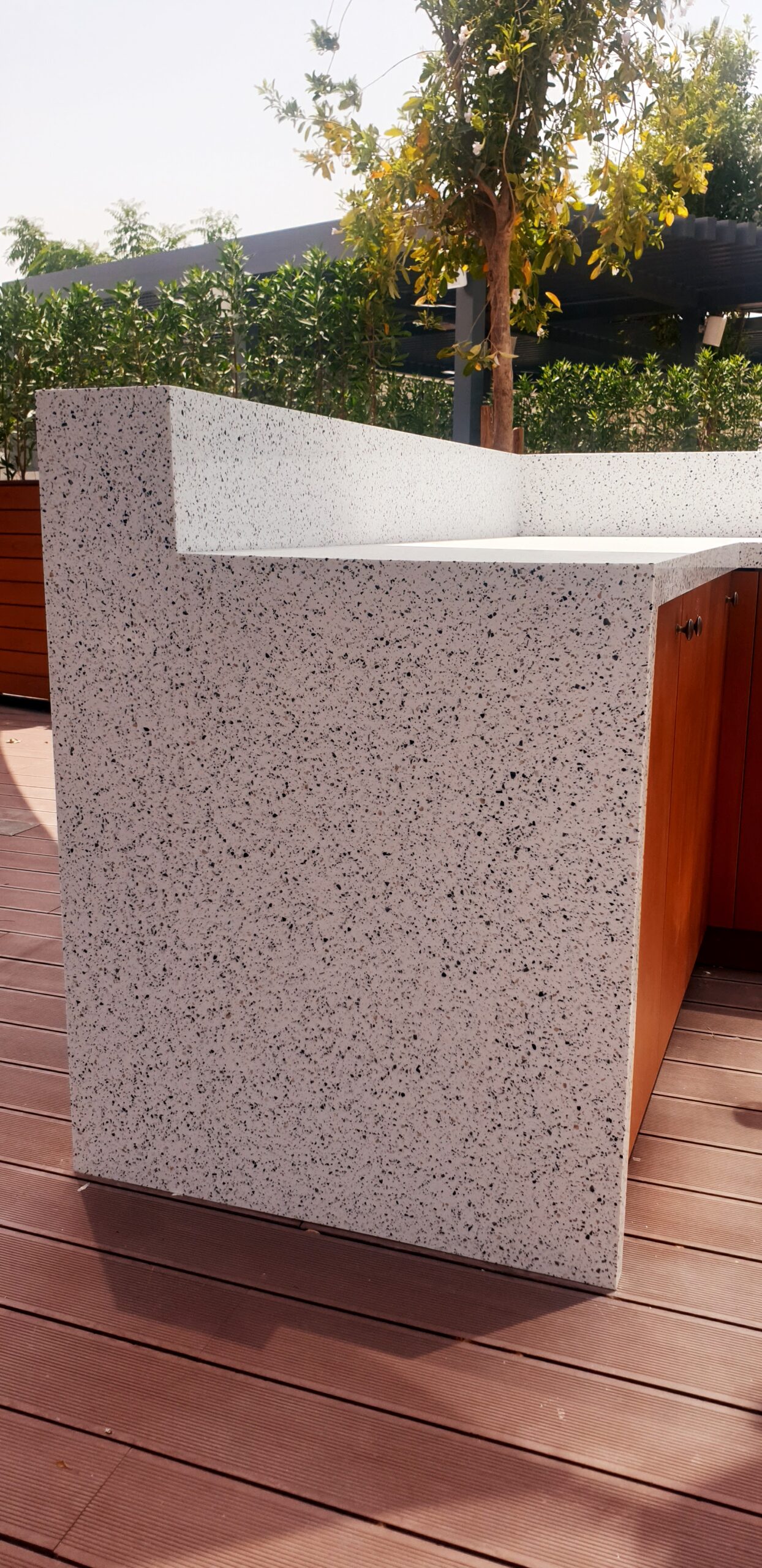 Our Salvocorp UAE tea m partnered with Batimat Solid Surface Technical Services LLC to craft an impressive reception area, complete with functional work surfaces and countertops in the massively popular finish, Terrazzo Venezia. Solid surfaces are well suited to cafes, restaurants, and reception areas, due to its non-porous, homogenous design which prevents mould and germs. It’s also impact and scratch resistant ensuring its viability for high-traffic areas.